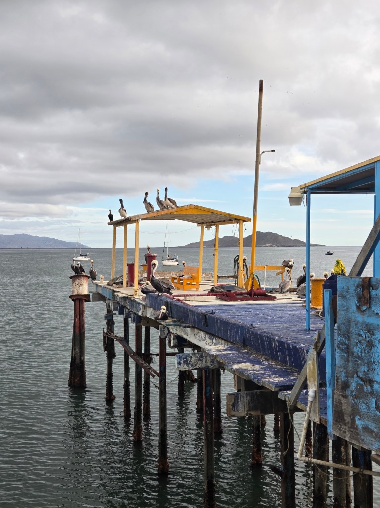 We were so excited to be at our first real anchorage we got the paddle boards out and explored, even though there wasn’t much to see. The main event of Tortuga Bay is a place stop and rest with access to diesel about half way down the Pacific side of the Baja coast. A huge group of dolphins lives in the bay, and they swam through the anchorage multiple times a day. Every time we got the dingy out to explore somewhere in the bay, we had a dolphin escort. Followed by the pelicans. And then the aggressive seals who thought we must have fish like the pangas. One seal got so close he jumped up over the dingy motor and scared the hell out of us, upset we weren’t throwing fish overboard.
