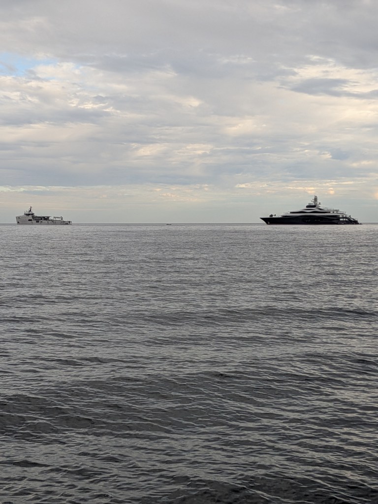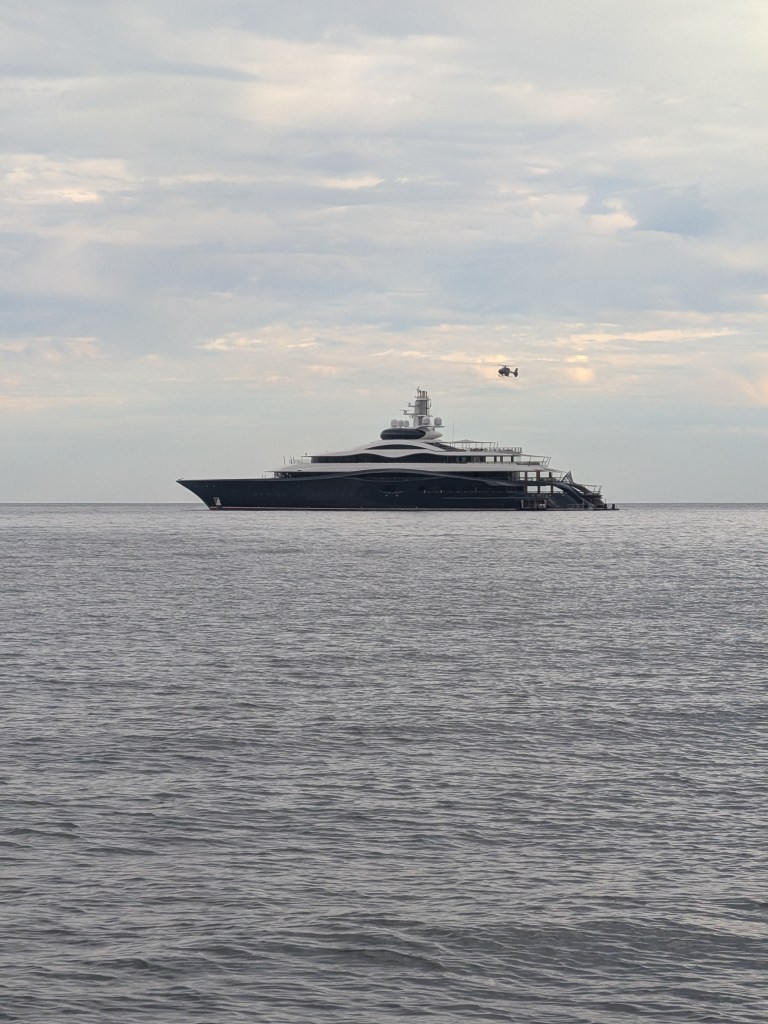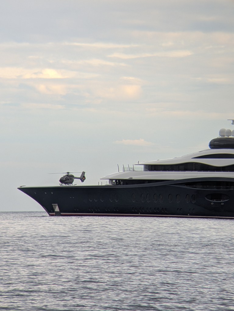 Which I suppose is why billionaires started showing up. As we were sweating through our sun shirts on the deck trying to re-install the mast blocks, Mark Zuckerberg pulled up in his super yacht with his support boat, his helicopter, and his tender. They made quite the commotion arriving, but by the time they got the water-level living room door folded out (very cool) the whales started the most spectacular show we’ve seen yet. Breaching out of the water in the middle of the anchorage with a baby.